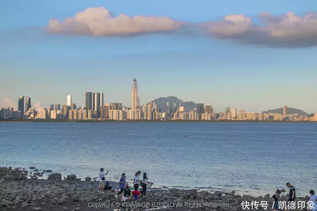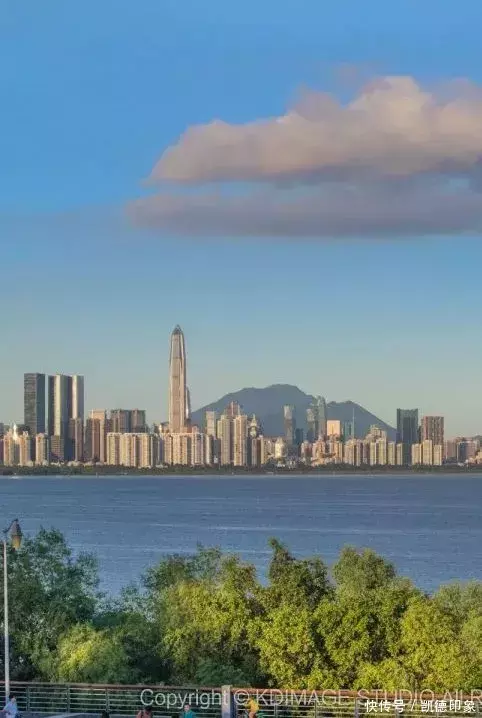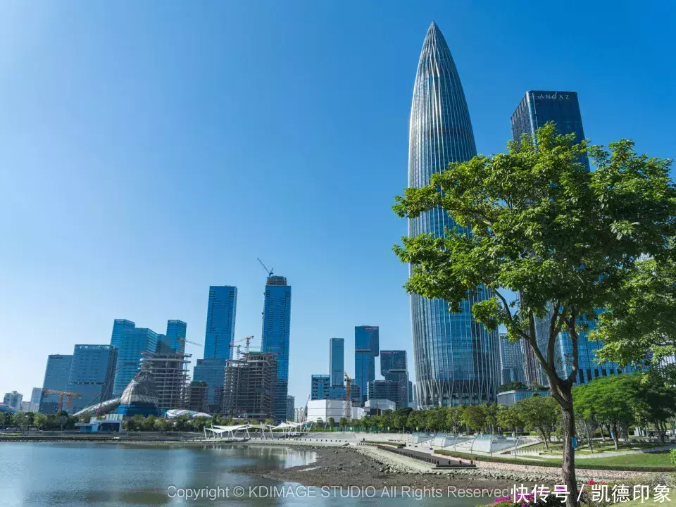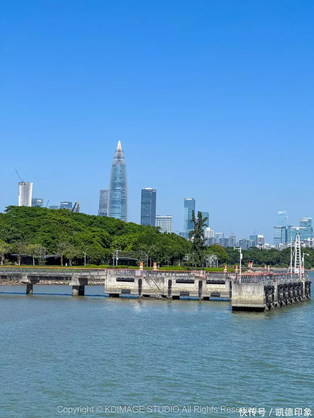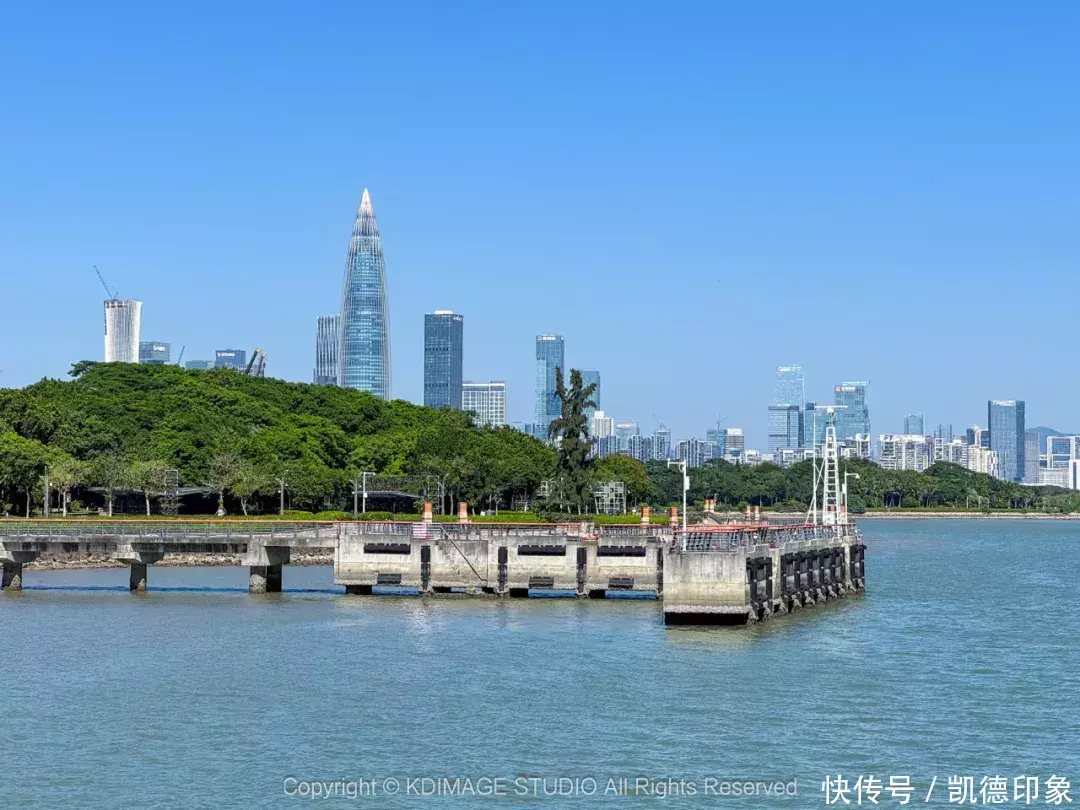 沿着海边方向走,回头就可以打卡深圳地标“春笋”。内海海面倒映出建筑群,高楼与海景结合,自由又现代。如果是周末或者节假日晚上过来的话,还能遇到灯光秀和无人机表演。
