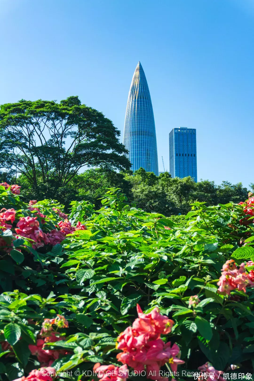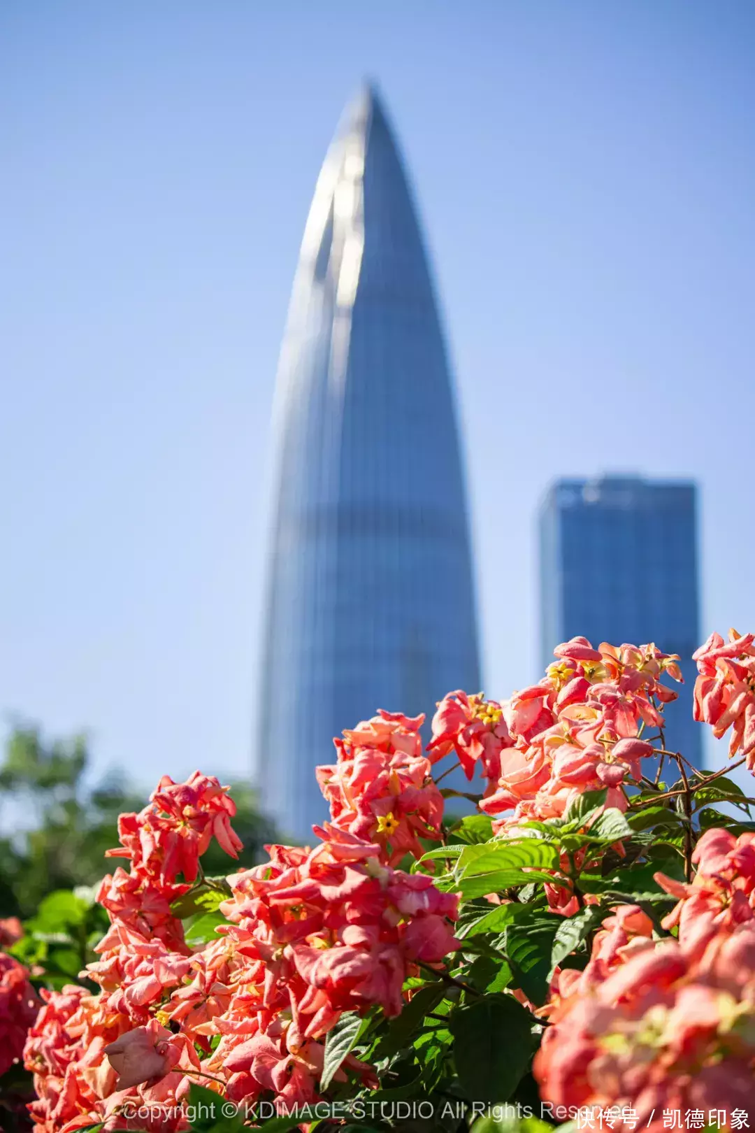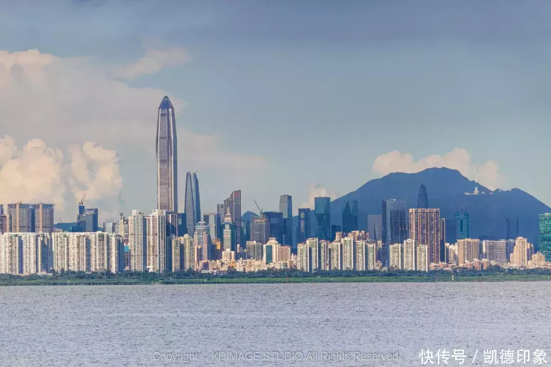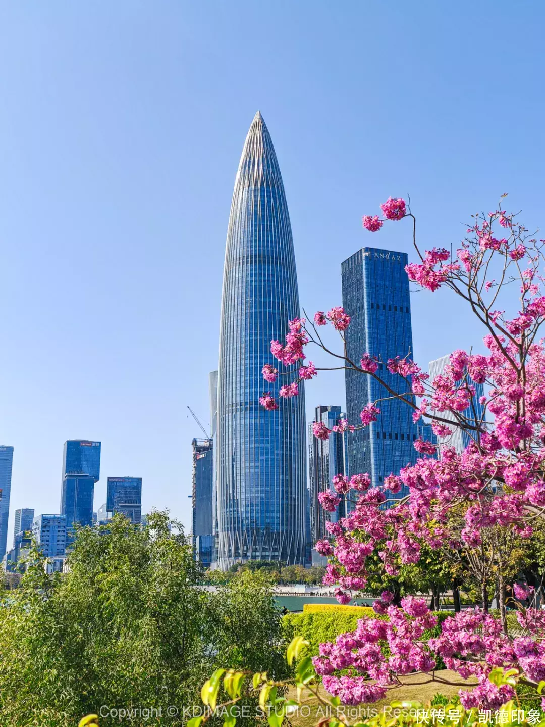 沿着海边方向走,回头就可以打卡深圳地标“春笋”。内海海面倒映出建筑群,高楼与海景结合,自由又现代。如果是周末或者节假日晚上过来的话,还能遇到灯光秀和无人机表演。