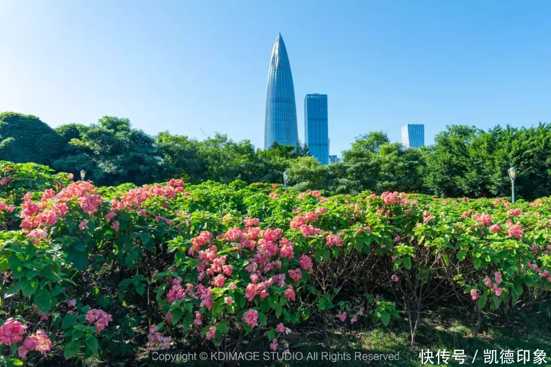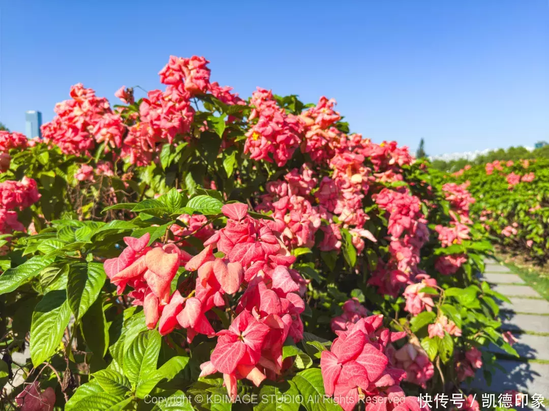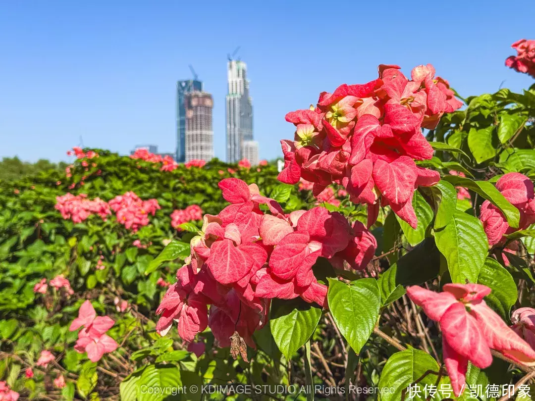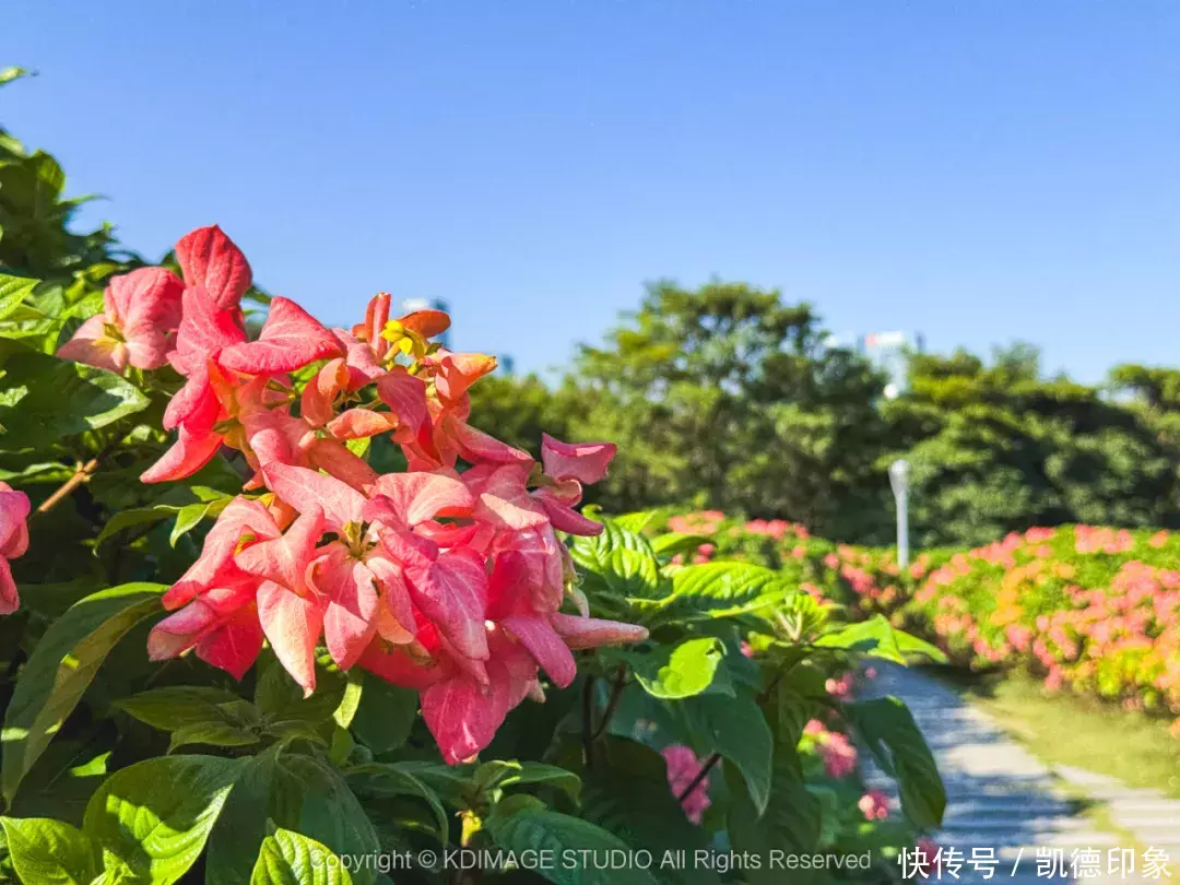 从人才公园,继续朝着海边方向走,穿过大桥往前之后左拐便来到深圳湾流花山公园。而现在流花山公园最火的就是盛放的纸扇花海,花海主要是粉色,不过还有白色、橙黄色……五颜六色真的太迷人了。